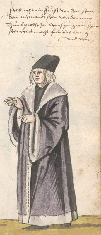 Herzog Albrecht IV. von Bayern-München. Abb. aus: CXCIV Abbildungen aus dem Regentenhaus Pfalzbayern mit Text in Prosa und Versen, Anfang 16 Jh., fol. 78r. (Bayerische Staatsbibliothek Cgm 1604)