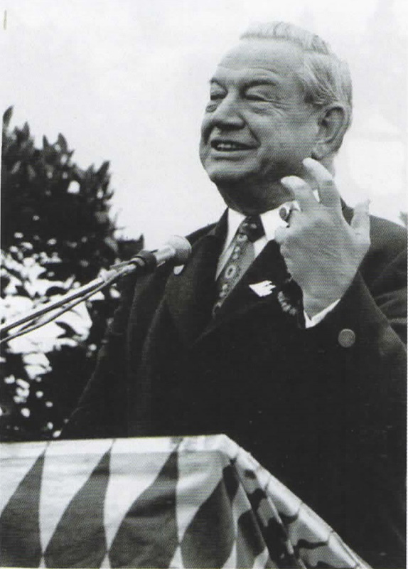 Ansprache des bayerischen Ministerpräsidenten Alfons Goppel bei seiner Rede zur 150-Jahr-Feier an der Konstitutionssäule in Gaibach. Bild: Heer. (Bayerische Einigung, Bayernspiegel) HLB