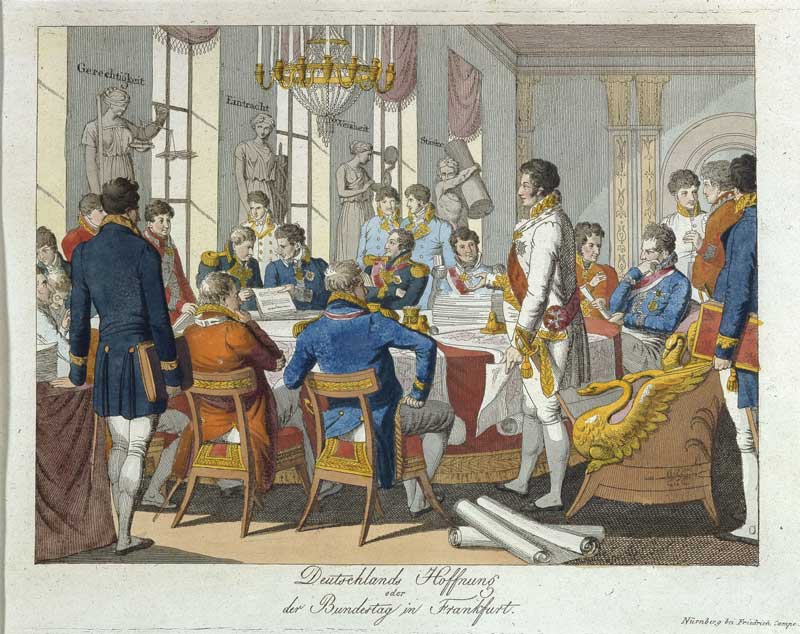 „Deutschlands Hoffnung oder der Bundestag in Frankfurt“, Allegorische Darstellung des Bundestags von Friedrich Campe (1777-1846), 1816/17. (Historisches Museum Frankfurt, Foto: Horst Ziegenfusz lizenziert durch CC-BY-SA) HLB