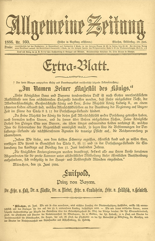 Allgemeine Zeitung vom 10. Juni 1886, in der die Regierungsunfähigkeit König Ludwigs II. (1845-1886, König 1864-1886) bekannt gemacht wird. (Bayerische Staatsbibliothek, 4 Eph.pol. 50-1886,5/6) HLB
