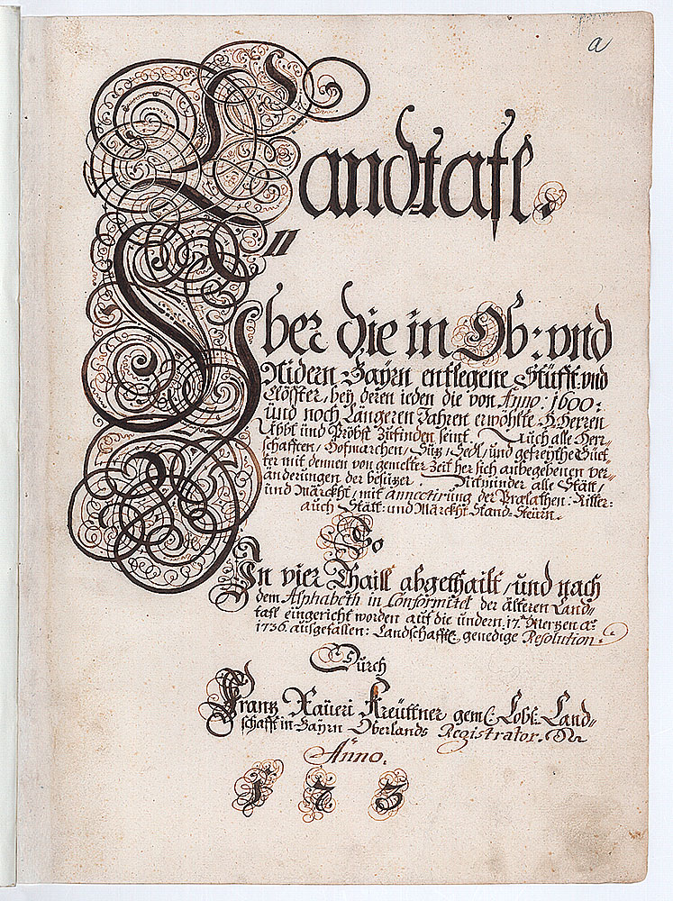 Landtafel von 1736, Band 1 - Einleitungsvermerk. (BayHStA, Altbayerische Landschaft Literalien 132)