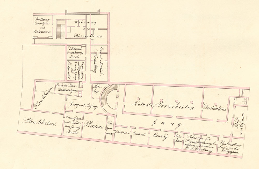 Grundriss des ersten Obergeschosses der Steuerkatasterkommission. Abb. aus: Georg Friedrichs Ziebland, Steuerkataster-Kommission, München 1831. (Bayerische Staatsbibliothek, Cod.icon. 214) HLB