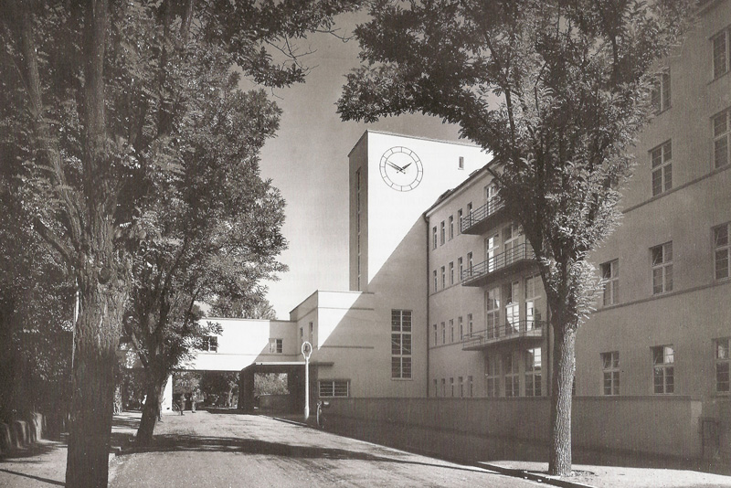 Heinrich Zierl, "Altes" Krankenhaus in Schweinfurt, Nordseite mit Brücke, Turm und Eingang. 1929 bis 1930. Foto 1930. (Stadtarchiv Schweinfurt) HLB