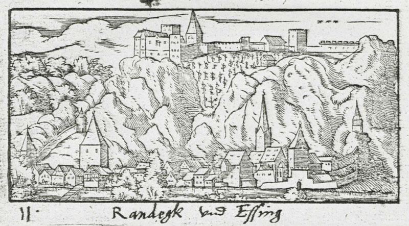 Burg Randeck oberhalb von Essing, Holzschnitt von Jost Amman, um 1560, aus dem Nachlass Philipp Apians in der Bayerischen Staatsbibliothek (BSB-Hss Cgm 5379(3)). Urheberrechtliche Lizenz muss beim Rechteinhaber eingeholt werden.