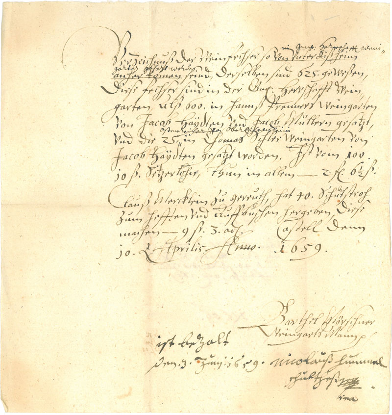 Erste Erwähnung des Silvaners (Österreicher Reben) auf einem Belegzettel vom 10. April 1659 einer Amtsrechnung des Amtes Castell. (Fürstlich Castell`sches Archiv (FCA) KA G II 3b, 63)