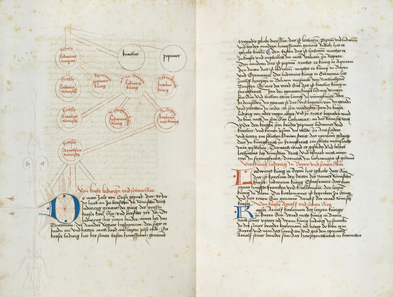 Auszug aus Andreas von Regensburgs Werk „Chronik von den Fürsten zu Bayern“ aus dem 15. Jahrhundert. ([https://doi.org/10.11588/diglit.393 Universitätsbibliothek Heidelberg, Cod. Pal. germ. 94, fol. 16v-17r) HLB