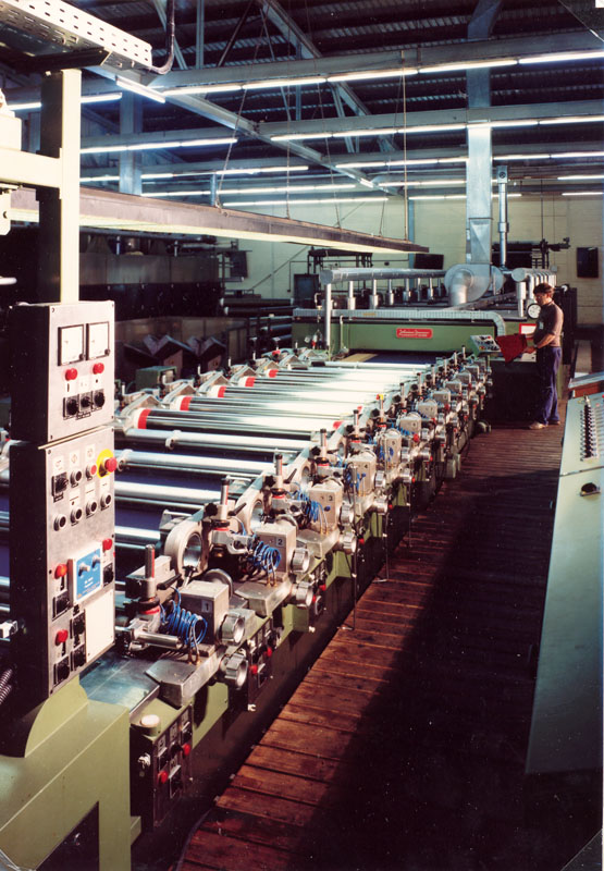 Anlage mit Maschinen für den Rotationsschablonendruck in der Neuen Augsburger Kattunfabrik (NAK), 1980er Jahre. (Staatliches Textil- und Industriemuseum Augsburg)