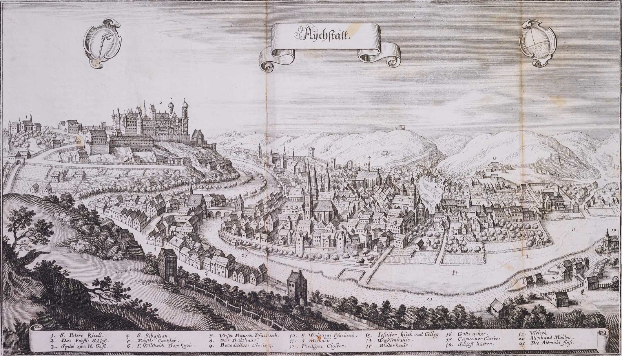 Ansicht von Eichstätt. Stich von Matthäus Merian. (Gemeinfrei via Bayerische Staatsbibliothek, Topographia Franconiae) HLB