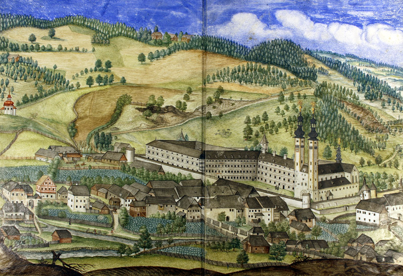 Ansicht des Domstiftes und des Ortes Gurk im sogenannten Verbrüderungsbuch des Gurker Domkapitels aus dem Jahre 1685. (Archiv der Diözese Gurk, DKA HS 1)