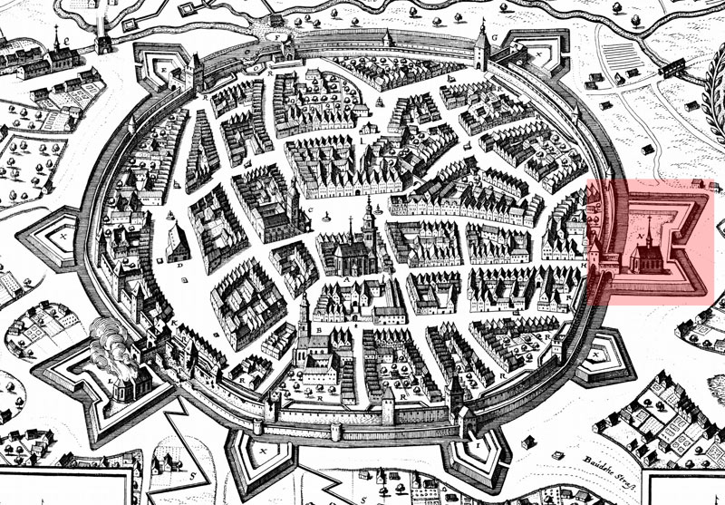 Abbildung eines Hornwerks (markiert) der Stadtmauer von Zittau in einem Stich von Matthäus Merian dem Älteren aus dem 17. Jahrhundert (Ausschnitt). Ein ähnliches Hornwerk wurde während der schwedischen Besatzungszeit 1631-1634 vor den Graben des Nordwestturms der Echterbastei der Festung Marienberg platziert und ersetzte den dort zuvor errichteten Halbmond. (Gemeinfrei über Wikimedia Commons) HLB
