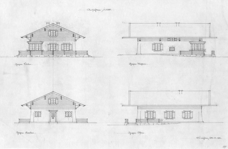 Entwurf einer Blockhütte für Gerdy Troost, 24.11.1934. (Bayerische Staatsbibliothek, Ana 325.A.V.14.15) HLB