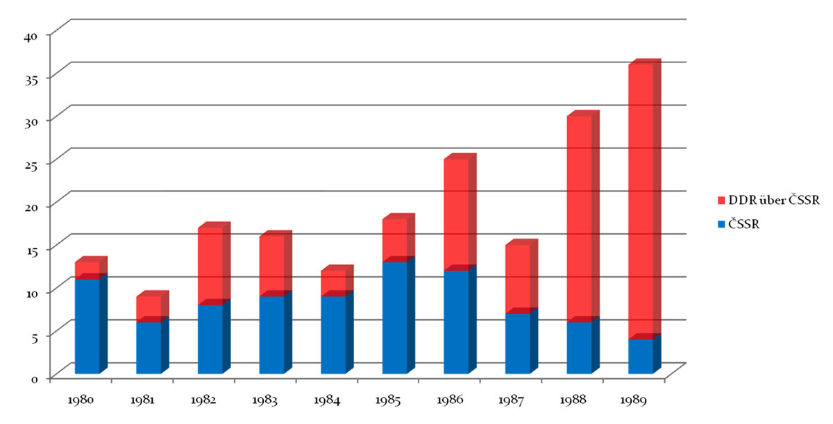 Anteil von DDR-Flüchtlingen an den Gesamtfluchtzahlen aus der Tschechoslowakei nach Bayern von 1980 bis Oktober 1989. (Markus Meinke) HLB