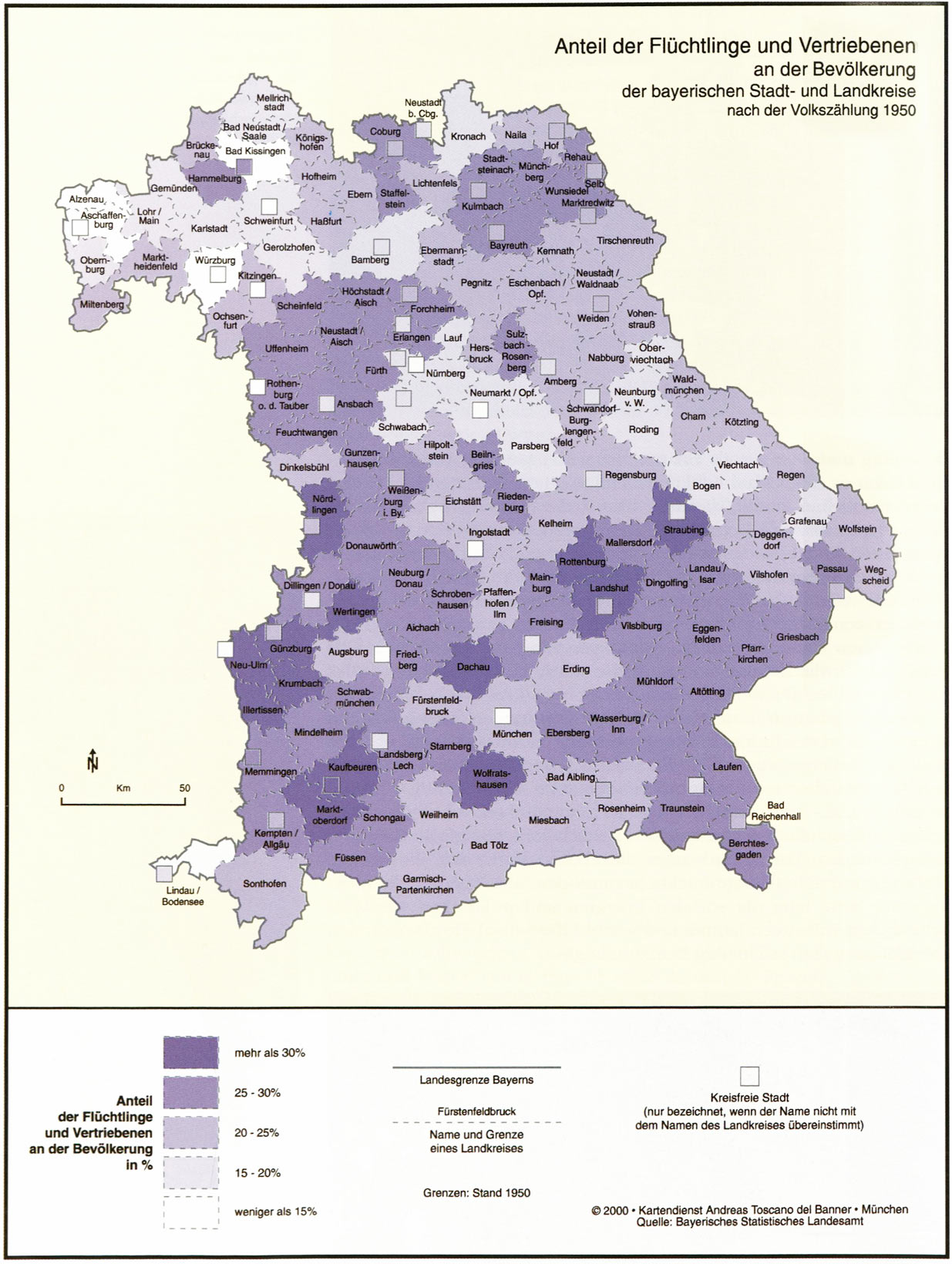 Anteil der Flüchtlinge und Vertriebene an der Bevölkerung in Bayern 1950. (© 2000 Kartendienst Andreas Toscano del Banner, München, Quelle: Bayerisches Statistisches Landesamt) HLB
