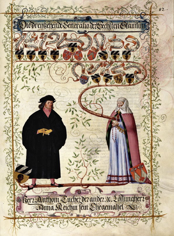 Anton II. Tucher (1458-1524) beauftragte Veit Stoß im Jahre 1517 mit der Anfertigung eines Schnitzwerkes für den Hallenchor von St. Lorenz. (Abb. aus dem "Großen Tucherbuch", Stadtarchiv Nürnberg, E29/III Nr. 258 fol. 82r)