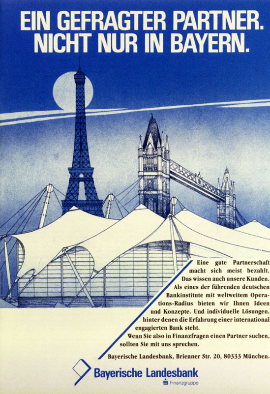 „Gefragter Partner nicht nur in Bayern“ – Werbeanzeige der Bayerischen Landesbank, um 1993. (Hubert Bauer [Hg.], Bayern LB. Die Geschichte in Bildern, München 2009, 225) HLB