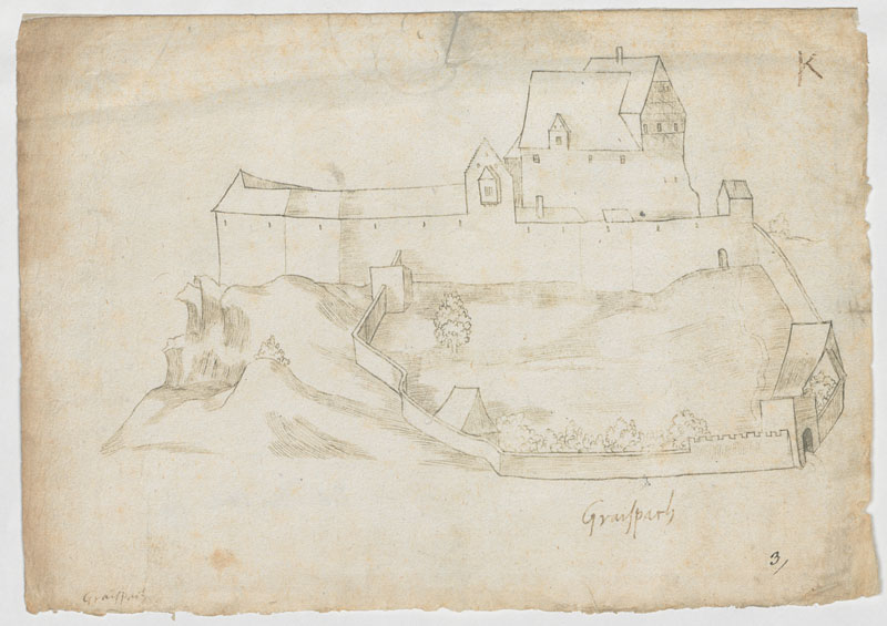 Burg Graisbach, Zeichnung von Philipp Apian (1531-1589), um 1560. (Bayerische Staatsbibliothek, Cgm 5379(3)