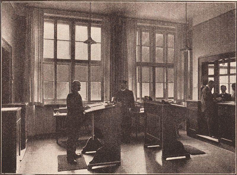 Vermittlungsraum für Holz- und Metallarbeiter im Münchner Arbeitsamt, Foto um 1916. Abb. aus: Hans Grässel, Das städtische Verwaltungsgebäude für Arbeiterangelegenheiten in München, München 1916, 74. (Bayerische Staatsbibliothek 4 Bavar. 3124 w)