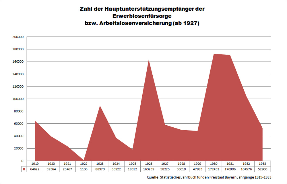 Zahl der Hauptunterstützungsempfänger der Erwerblosenfürsorge bzw. Arbeitslosenversicherung (ab 1927). (Quelle:Statistisches Jahrbuch für den Freistaat Bayern Jahrgänge 1919-1933)