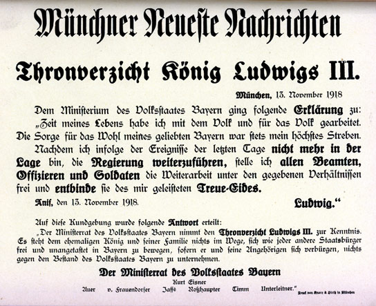 Veröffentlichung der Anifer Erklärung zusammen mit der Interpretation durch die Regierung Eisner als Sonderausgabe der Münchner Neuesten Nachrichten.