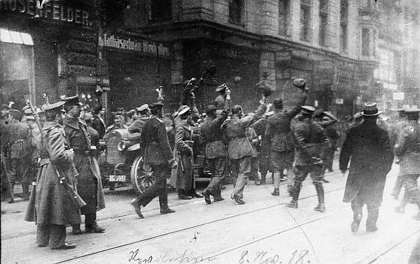 Jubelnde Soldaten vor dem Münchner Mathäserbräu am 8. November 1918. (Bayerische Staatsbibliothek, Bildarchiv hoff-5123)