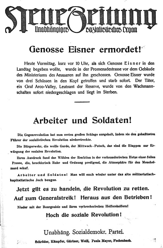 Sonderausgabe der "Neuen Zeitung" vom Vormittag des 21. Februar 1919, die zwar über die Ermordung Eisners (noch?) nicht, aber über das Attentat im Landtag berichtet. Der Aufruf "Hoch die soziale Revolution!" meint auch hier eine Veränderung der Gesellschaft durch eine "Zweite Revolution". (Bayerische Staatsbibliothek, 2 H.un.app. 44 m)