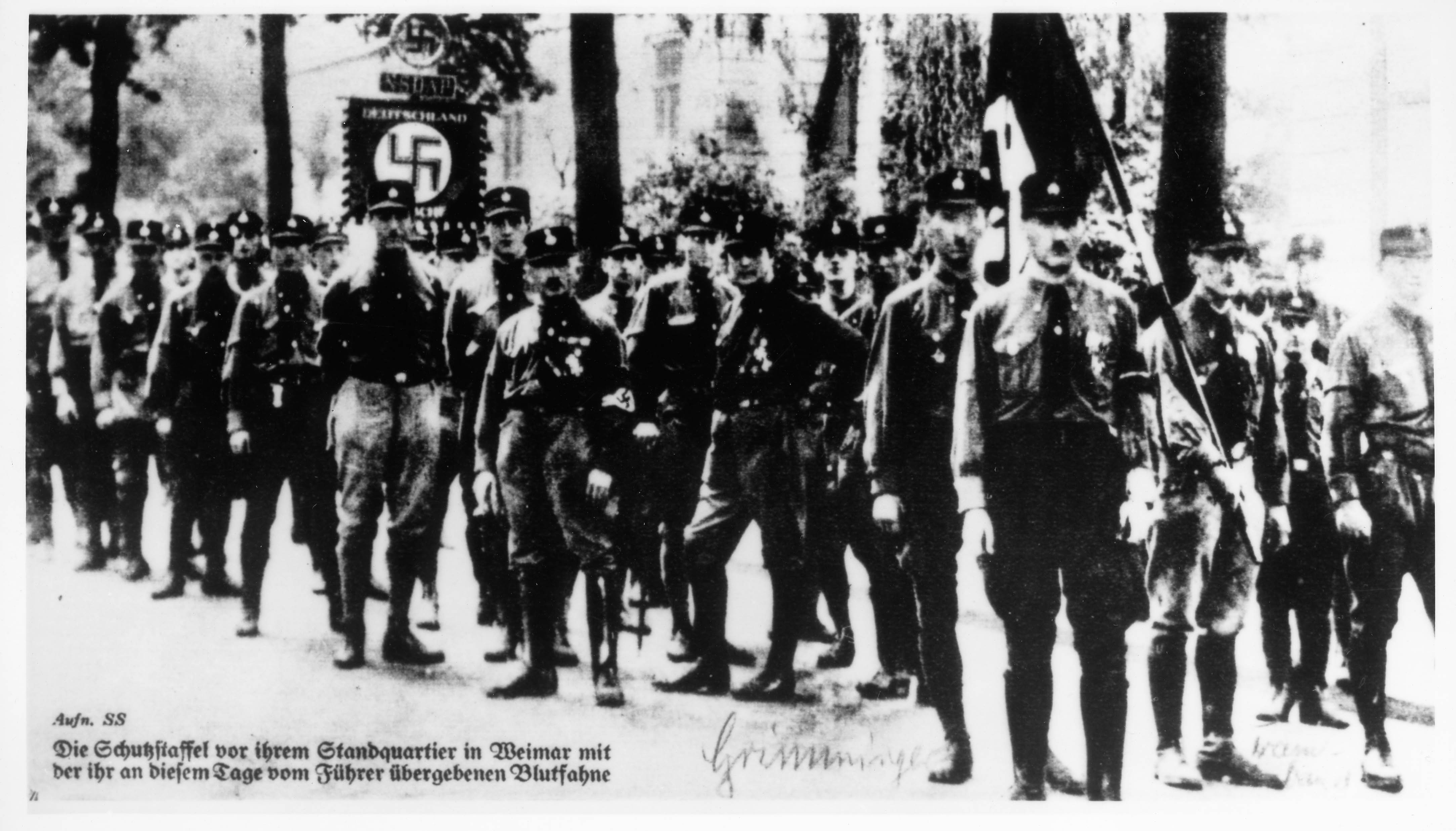 SS-Angehörige mit der "Blutfahne" auf dem Reichsparteitag der NSDAP in Weimar am 3./4. Juli 1926. (Bayerische Staatsbibliothek, Fotoarchiv Hoffmann)