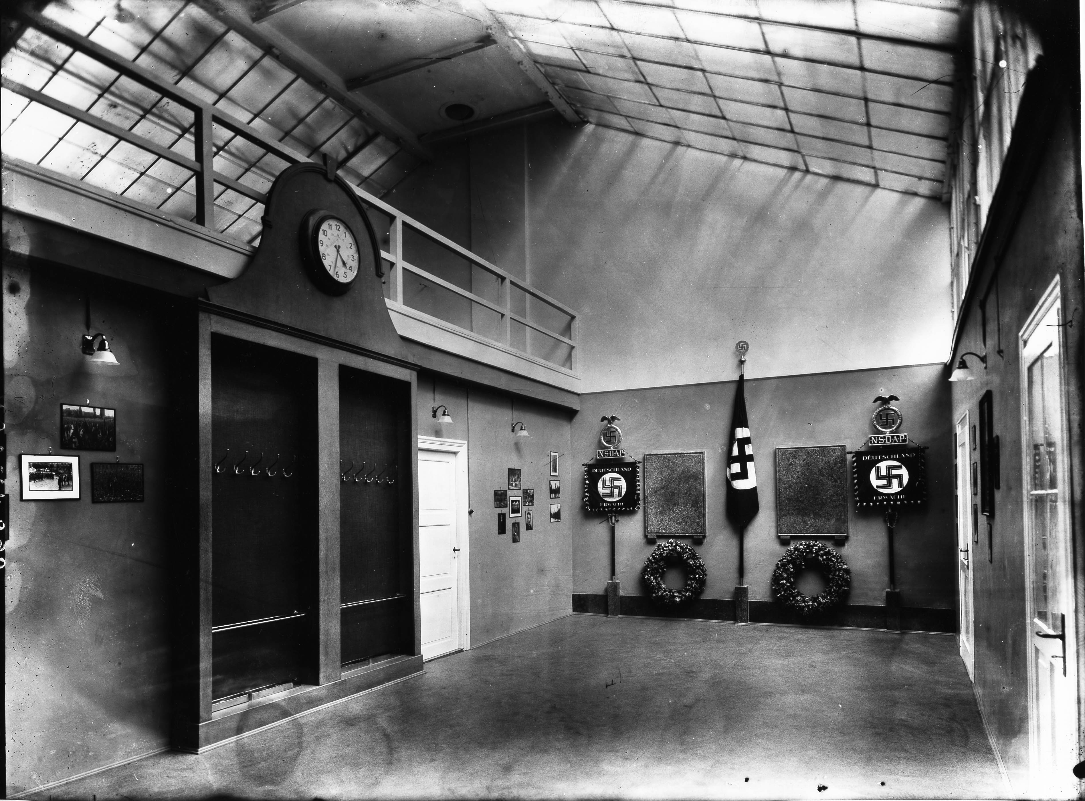 Innenansicht der Reichsgeschäftsstelle der NSDAP in der Münchner Schellingstraße 50, Ehrensaal der SA mit der "Blutfahne". (Bayerische Staatsbibliothek, Fotoarchiv Hoffmann)