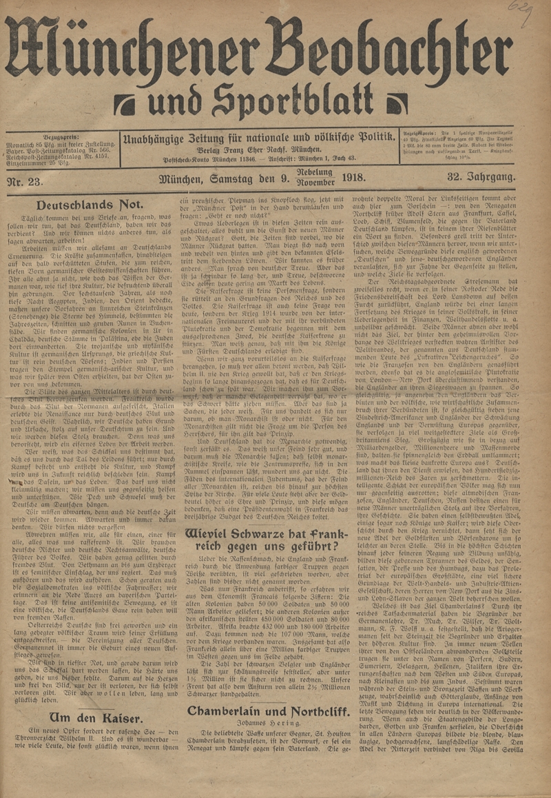 Titelseite des Münchener Beobachters vom 9. November 1918.