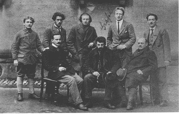 Räterepublikaner in der Festungshaftanstalt Niederschönenfeld [vlnr: Markus Reichert, Toni Waibel, August Hagemeister, Rudolf Hartig, Erich Mühsam, Paul Graßl, Wilhelm Olschewsky, Josef Renner], um 1920 [JustizvollzugsanstaltNiederschönenfeld]