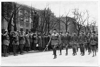 Parade nach der Grundsteinlegung des Kriegerdenkmals im Münchner Hofgarten am 4. November 1923, Parade des Bundes Oberland. (Bayerische Staatsbibliothek, Fotoarchiv Hoffmann)