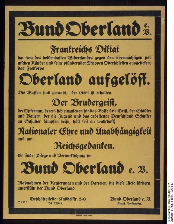 Plakat, das die Auflösung des Freikorps Oberland und die Gründung des Bundes Oberland ankündigt, ca. 1921/22. (Bundesarchiv, Plak 002-007-182/Grafiker: o. A.)