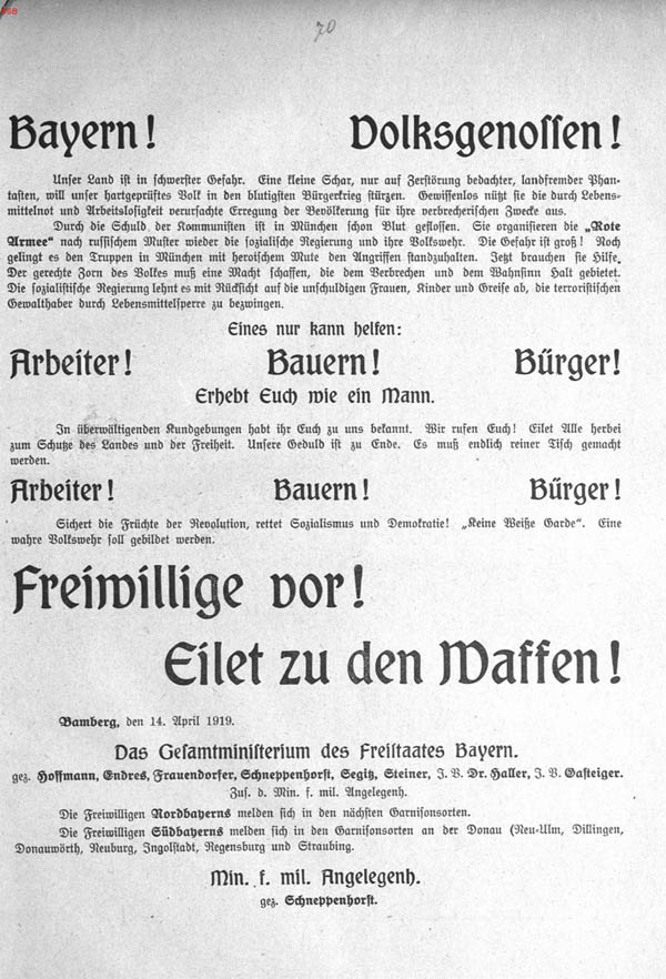 Aufruf der Regierung Hoffmann vom 14. April 1919 zur Bildung von Freiwilligen-Verbänden. (Bayerische Staatsbibliothek, 4 H.un.app. 219 t-1/145)
