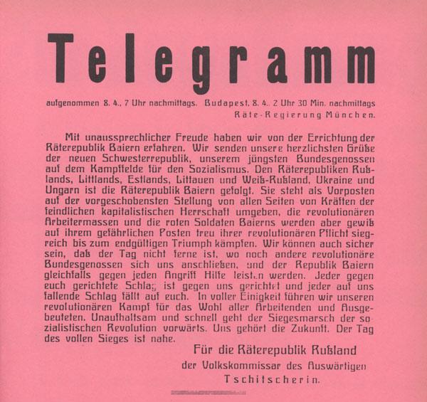 Grußtelegramm an die Räteregierung in München, abgesandt vom russischen Volkskommissar des Auswärtigen, Grigorij Wassiljewitsch Tschitscherin, am 8. April 1919. (Bayerisches Hauptstaatsarchiv, Plakatsammlung)