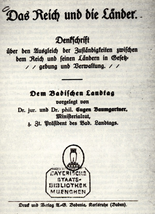 Denkschrift des badischen Landtagspräsidenten Eugen Baumgartner, Karlsruhe 1923, Titelblatt.
