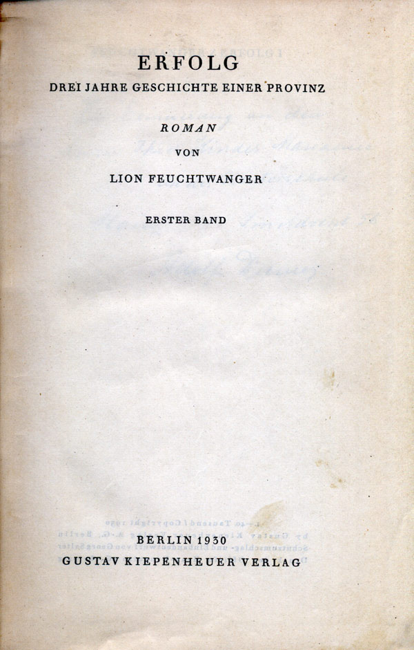 Titelblatt der Erstausgabe von Lion Feuchtwanger, Erfolg, Gustav Kiepenheuer Verlag, Berlin1930.