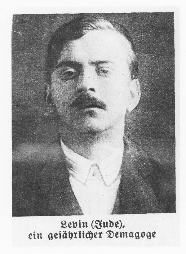 Max Levien (1885-1937), Mitbegründer der Münchner Gruppe des Spartakusbundes. Antisemitische Propagandapostkarte [Levien war nicht jüdischer Herkunft!] mit der Aufschrift "Levin (Jude), ein gefährlicher Demagoge". (Bayerische Staatsbibliothek, Fotoarchiv Hoffmann)