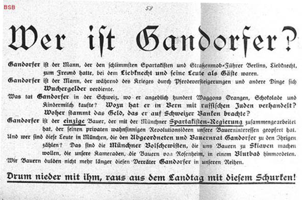 Hetzflugblatt gegen Bauernführer Karl Gandorfer nach dem 2. Mai 1919. Die Vorwürfe gegen Gandorfer hinsichtlich des Pferdekaufs und seiner Schweizreise erwiesen sich als haltlos. (Bayerische Staatsbibliothek, 4 H.un.app. 1071 t-58)