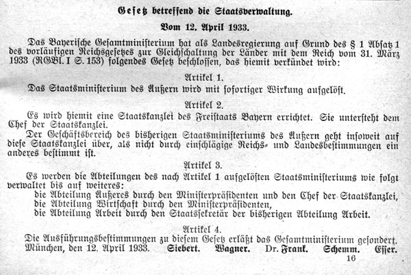 Gesetz betreffend die Staatsverwaltung vom 12 April 1933 [Auflösung des Außenministeriums, Errichtung der Staatskanzlei] [Gesetz- und Verordnungs-Blatt für den Freistaat Bayern 1933, S113]
