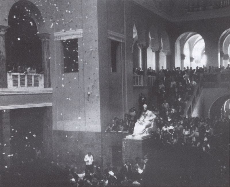 Sit-in und Flugblattabwurf - in Nachahmung der Geschwister Scholl - im Lichthof der Universität München Ende Mai 1968. (Universitätsbibliothek München, Fotosammlung)