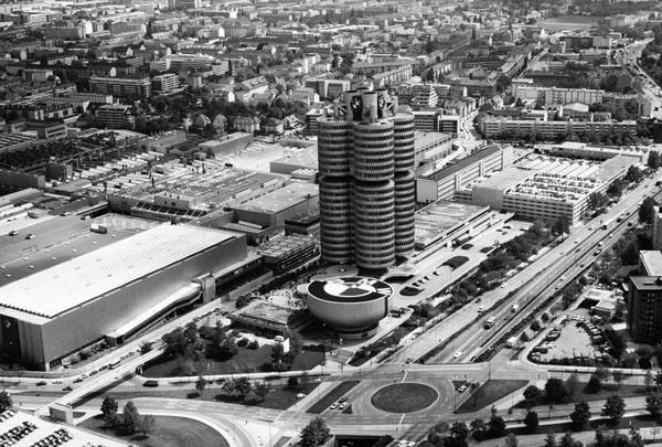 BMW-Hochhaus (sog. BMW-Vierzylinder), BMW-Museum und BMW-Werk in München: Das vom Wiener Architekten Karl Schwanzer (1918-1975) geplante Ensemble aus BMW-Museum und BMW-Hochhaus prägt seit seiner Errichtung das BMW-Quartier im Münchner Norden. Gemeinsam mit den Gebäuden für die Olympischen Spiele von 1972 wurde es zum Symbol für das moderne München der Nachkriegszeit. (Aufnahme vom Olympiaturm aus, 1984, BMW AG Konzernarchiv)