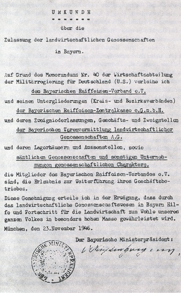 Wiederzulassung der Baywa durch Ministerpräsident Wilhelm Hoegner am 23. November 1946. (aus: Ernst Hohenegg, Raiffeisen in Bayern 1893-1968, München 1968, 222)