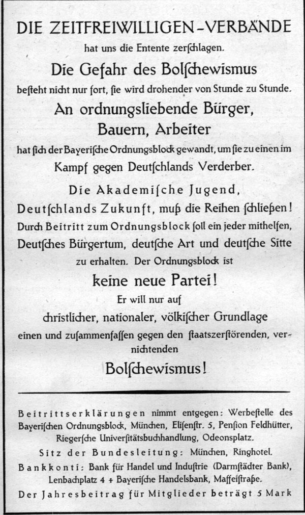 Aufruf zum Eintritt in den Bayerischen Ordnungsblock vom Mai 1920 [aus: Münchner Studentendienst 1 [1920], Nr 2/3,S31]