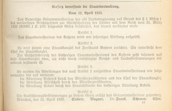 Gesetz betreffend die Staatsverwaltung vom 12. April 1933: Auflösung des Außenministeriums, Errichtung der Staatskanzlei. (aus: Gesetz- und Verordnungsblatt für den Freistaat Bayern 1933, 113)
