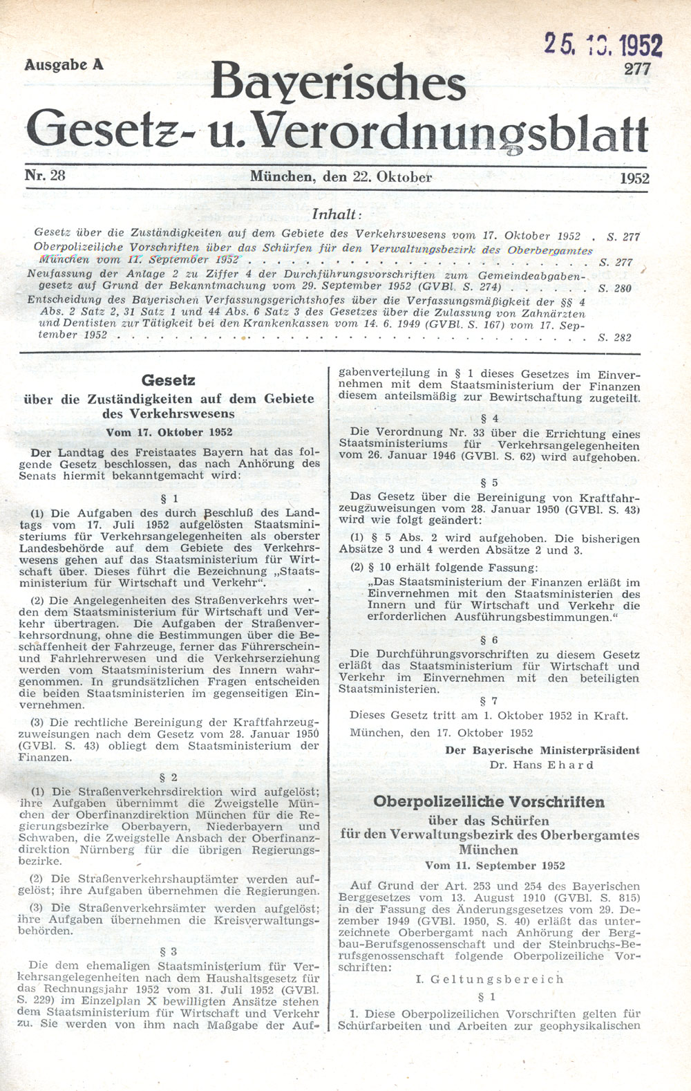 Neuordnung der Kompetenzen im Verkehrswesen nach der Auflösung des Verkehrsministeriums durch das Gesetz vom 17. Oktober 1952. (Abb. aus: Bayerisches Gesetz- und Verordnungsblatt 1952, Nr. 28, 277)