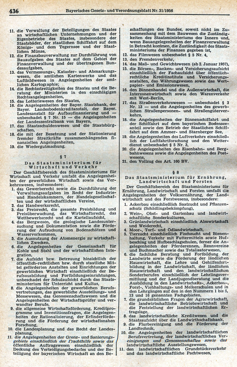 Zuständigkeitsbereich des Wirtschaftsministeriums, laut des Geschäftsverteilungsplans der Staatsregierung vom 19. Dezember 1956. (Abb. aus: Bayerisches Gesetz- und Verordnungsblatt 1956, 436)