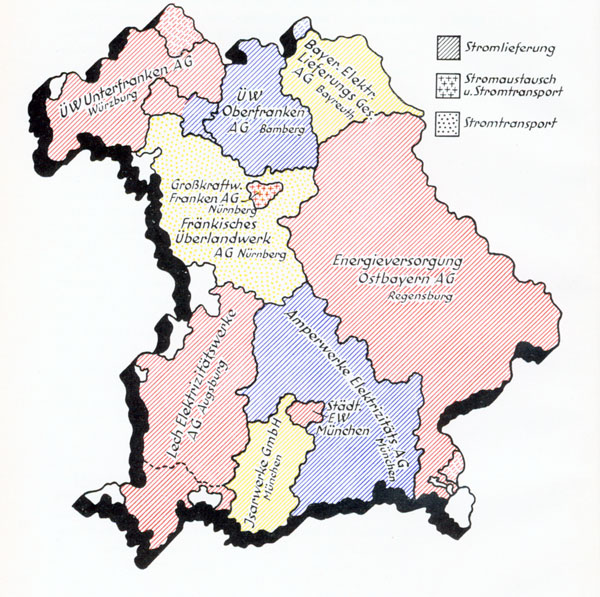 Das Bayernwerk und die größeren bayerischen Überlandwerke in den 1950er Jahren. Im Gegensatz zu anderen großen deutschen Elektrizitätsversorgern erreichte das Bayernwerk nicht den Endverbraucher, sondern kooperierte mit regionalen Versorgern. Eine Sonderrolle nahm Mittelfranken mit dem Großkraftwerk Franken ein. Erst schrittweise gelang es dem Bayernwerk, nicht nur seine eigenen Energiequellen zu vergrößern, sondern auch die regionalen Energieversorger zu übernehmen. Abb. aus: Siegfried Kurzmann u. Adolf Roth (Hg.), 30 Jahre Bayernwerk AG. Bayerische Landeselektrizitätsversorgung 1921-1951, München 1951, 18. (Bayerische Staatsbibliothek, 451.87)