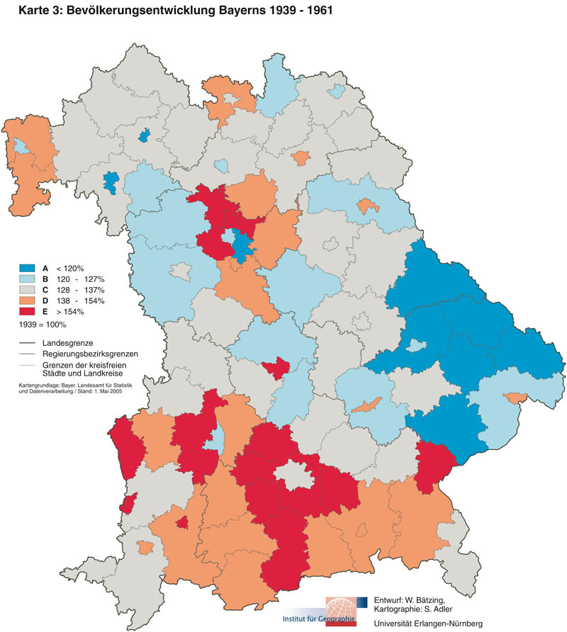 Karte 3: Bevölkerungsentwicklung Bayerns 1939-1961. (Entwurf: W. Bätzing, Kartographie: S. Adler, Universität Erlangen-Nürnberg)