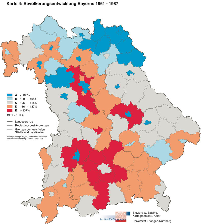 Karte 4: Bevölkerungsenwicklung Bayerns 1961-1987. (Entwurf: W. Bätzing, Kartographie: S. Adler, Universität Erlangen-Nürnberg)