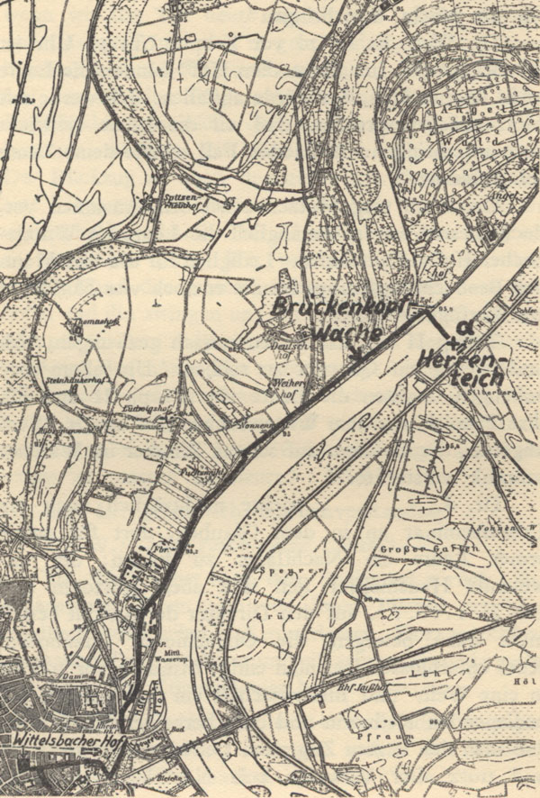 Skizze des Rheinübergangs der Speyerer Attentäter am 9. Januar 1924. (aus: Karlheinz Lintz, Grosskampftage. Aus der Separatistenzeit der Pfalz, Edenkoben 1930, 120)