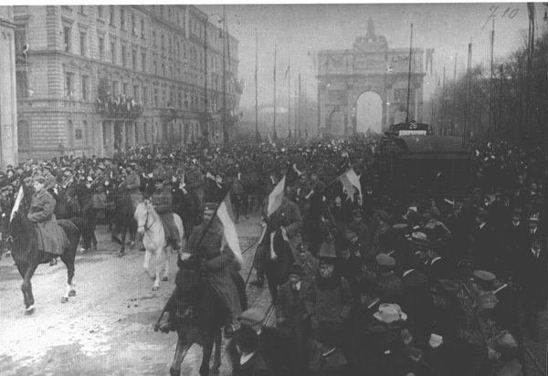 Einzug des 2 Bayerischen Infanterieregimentes in der Münchner Ludwigstraße, 8 Dezember 1918; im Hintergrund das Siegestor [Bayerische Staatsbibliothek, FotoarchivHoffmann]
